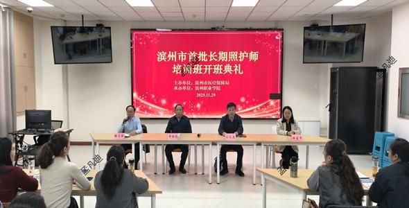 11月29日上午,滨州市首批长期照护师培训项目在滨州职业学院第二实训基地隆重举行。滨州职业学院党委副书记、院长申保忠、滨州市医疗保障局局长孙兆泉、副局长敬志强、南通市优质培训机构长期照护师授课专家徐富芹以及来自全市各县区的80位参训学员参加开班仪式。会议由敬志强主持。